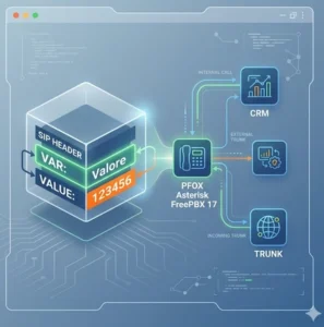 La comunicazione voip è molto utile soprattutto perchè riesce a realizzare il tanto noto concetto di UNIFIED COMMUNICATION. La creazione cioè, di una piattaforma di comunicazione sulla quale vengono scambiati dati sotto diverse forme: voce, dati aziendali, ecc. Il centralino voip è un componente fondamentale di tale struttura, il suo ruolo è amplificato se viene intergrato nel sistema informativo aziendale e scambia dati con gli altri componenti del sistema. Un tipo esempio di integrazione è quella che si realizza tra centralino voip e CRM. Spesso per realizzare ciò, bisogna scambiare dati tra centralino voip e CRM. Ci sono diversi metodi per scambiare i dati, tra i tanti, è possibile inserire e valorizzare delle variabili nel sip header. In questo articolo vedremo come fare ad aggiungere una variabile nel sip header utilizzando un centralino voip basato su Freepbx 17 ed asterisk 20.